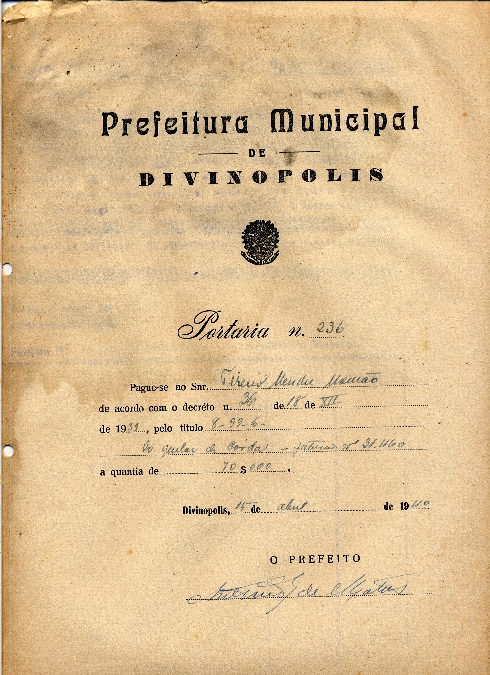 PAGUE-SE AO SNR TIRÉSIO MENDES MOURÃO DE ACORDO COM O DECRETO Nº 36 DE 18 DE XII DE 1939, PELO TÍTULO 8-99-6- 20 QUILOS DE CORDA - FATURA(SIC) Nº 31.460, A QUANTIA DE 70$000 (SETENTA MIL RÉIS)