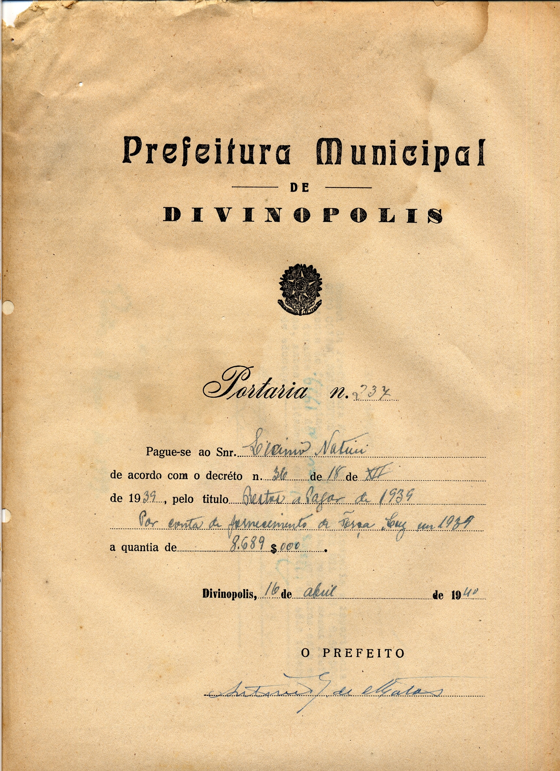PAGUE-SE AO SNR LICÍNIO NOTINI DE ACORDO COM O DECRETO Nº 36 DE 18 DE XII DE 1939, PELO TÍTULO RESTOS A PAGAR DE 1939 - POR CONTA DE FORNECIMENTO DA FORÇA E LUZ EM 1939, A QUANTIA DE 8.689$000 (OITO CONTOS, SEISCENTOS E OITENTA E NOVE MIL RÉIS)