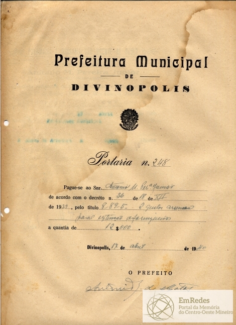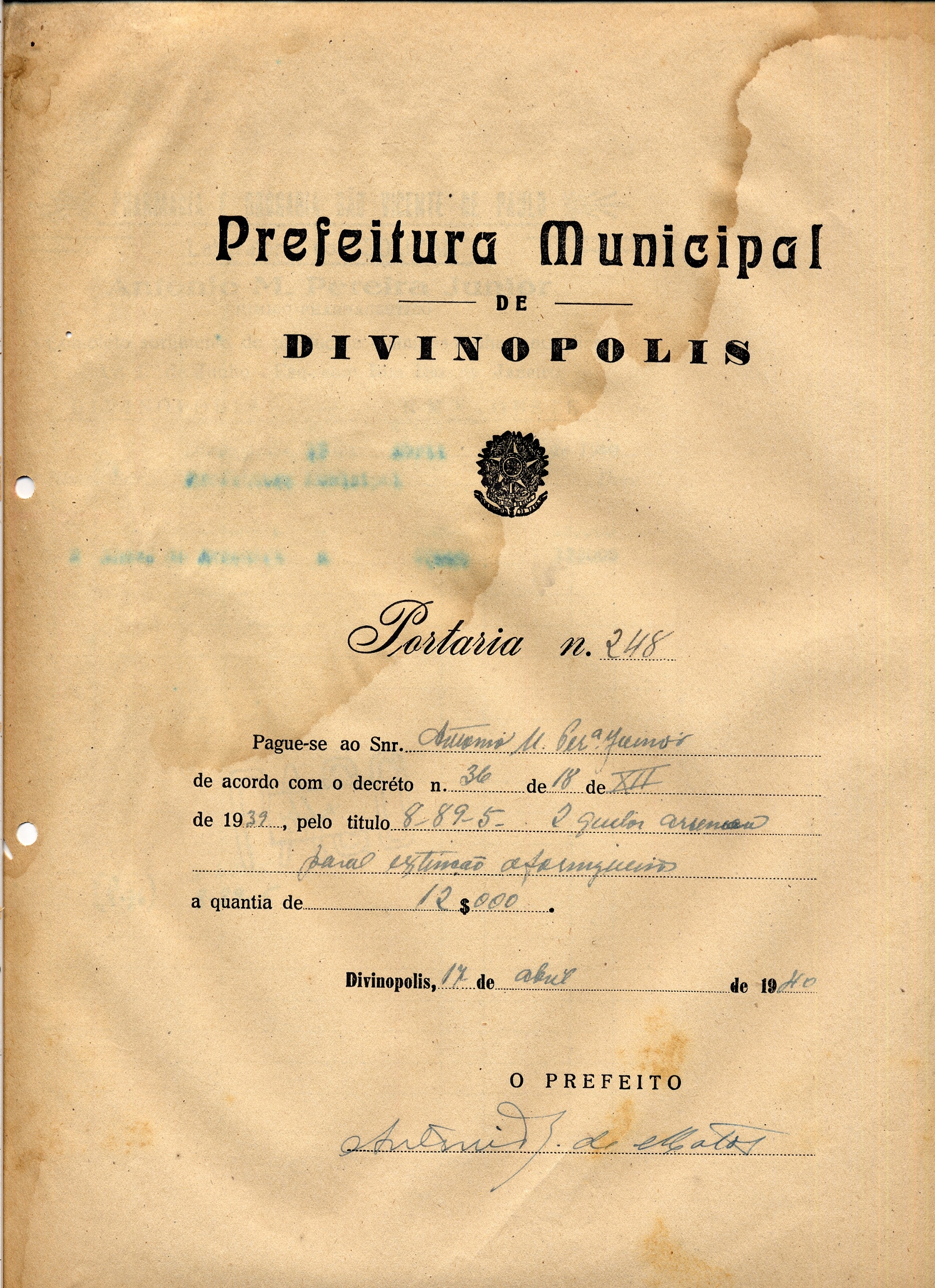 PAGUE-SE AO SNR ANTONIO M. PEREIRA JÚNIOR DE ACORDO COM O DECRETO Nº 36 DE 18 DE XII DE 1939, PELO TÍTULO 8-89-5 - 2 QUILOS DE ARSÊNICO PARA EXTINÇÃO DE FORMIGUEIROS, A QUANTIA DE 12$000 (DOZE MIL RÉIS)