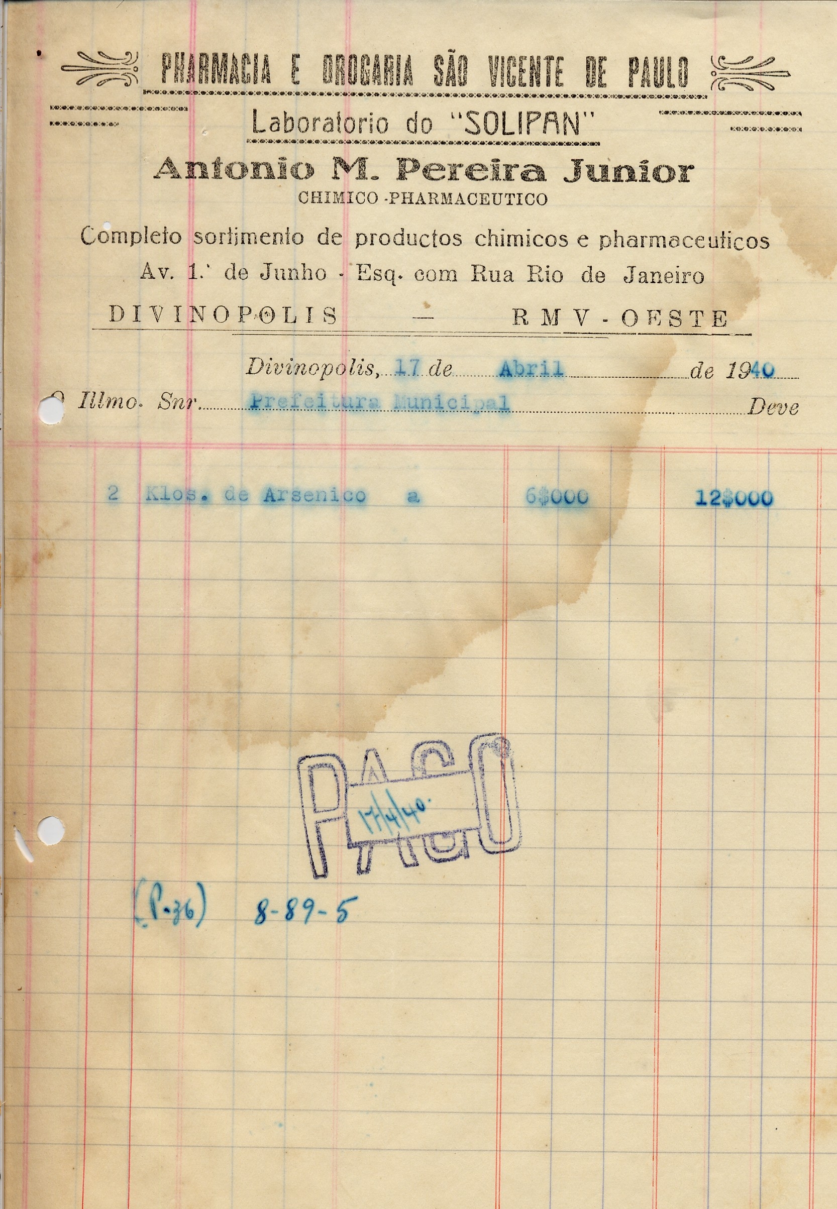 PAGUE-SE AO SNR ANTONIO M. PEREIRA JÚNIOR DE ACORDO COM O DECRETO Nº 36 DE 18 DE XII DE 1939, PELO TÍTULO 8-89-5 - 2 QUILOS DE ARSÊNICO PARA EXTINÇÃO DE FORMIGUEIROS, A QUANTIA DE 12$000 (DOZE MIL RÉIS)