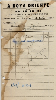 PREFEITURA MUNICIPAL DE DIVINÓPOLIS PORTARIA Nº 254 PAGUE-SE AO SNR HALIM SOUKI DE ACORDO COM O DECRETO Nº 36 DE 18 DE XII DE 1939, PELO TÍTULO 8-99-6 - 12 M DE FIO Pª INSTALAÇÃO ELÉTRICA NA PREFEITURA A QUANTIA DE 14$400 (QUATORZE MIL E QUATROCENTOS RÉIS) PREFEITO: ANTONIO GONÇALVES DE MATOS OBS: RECIBO REFERENTE A COMPRA DE FIOS.