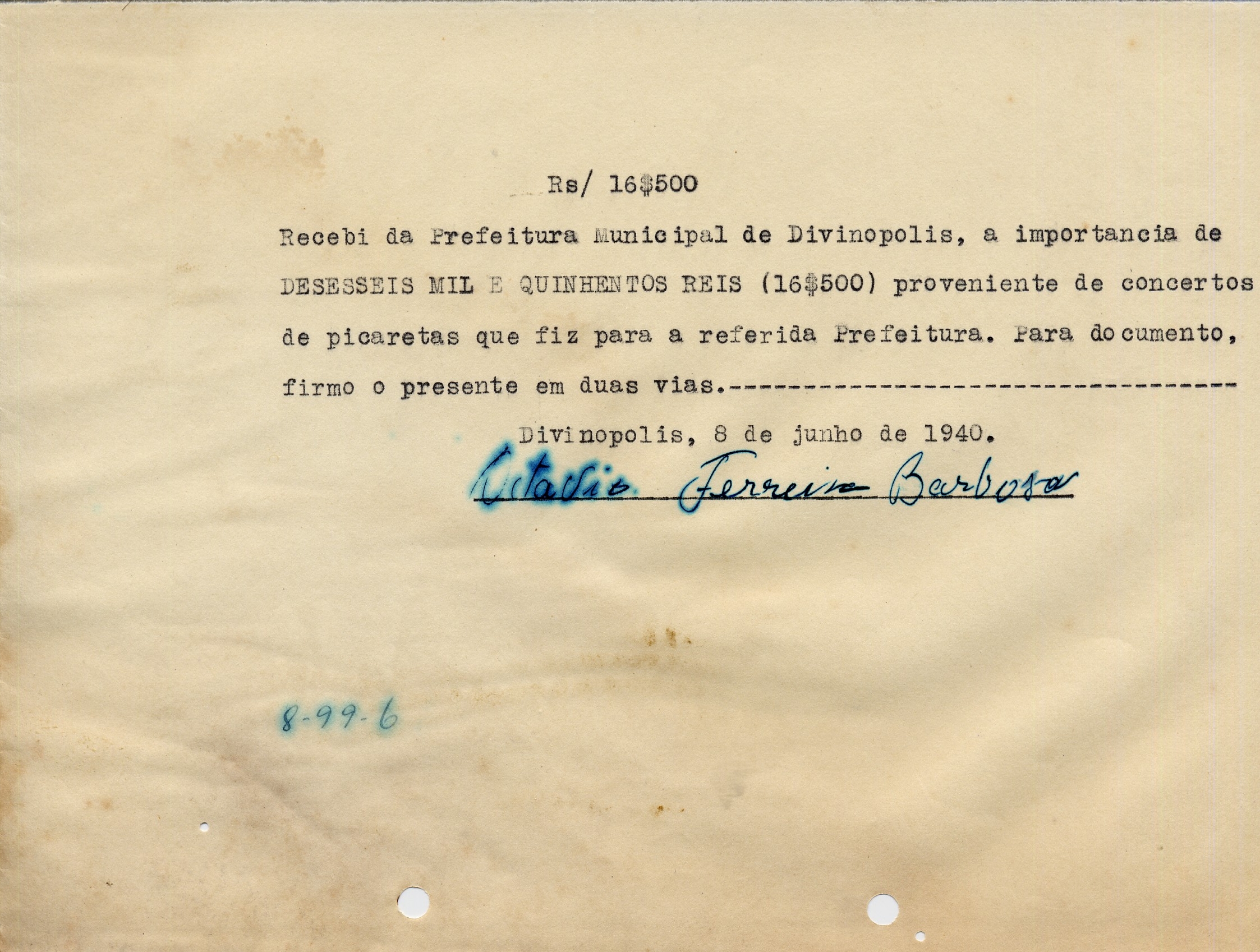 PAGUE-SE AO SNR OCTÁVIO FERREIRA BARBOZA DE ACORDO COM O DECRETO Nº 36 DE 18 DE XII DE 1939, PELO TÍTULO 8-99-6 CONCERTO(SIC) DE PICARETA, A QUANTIA DE 16$500 (DEZESSEIS MIL E QUINHENTOS RÉIS)