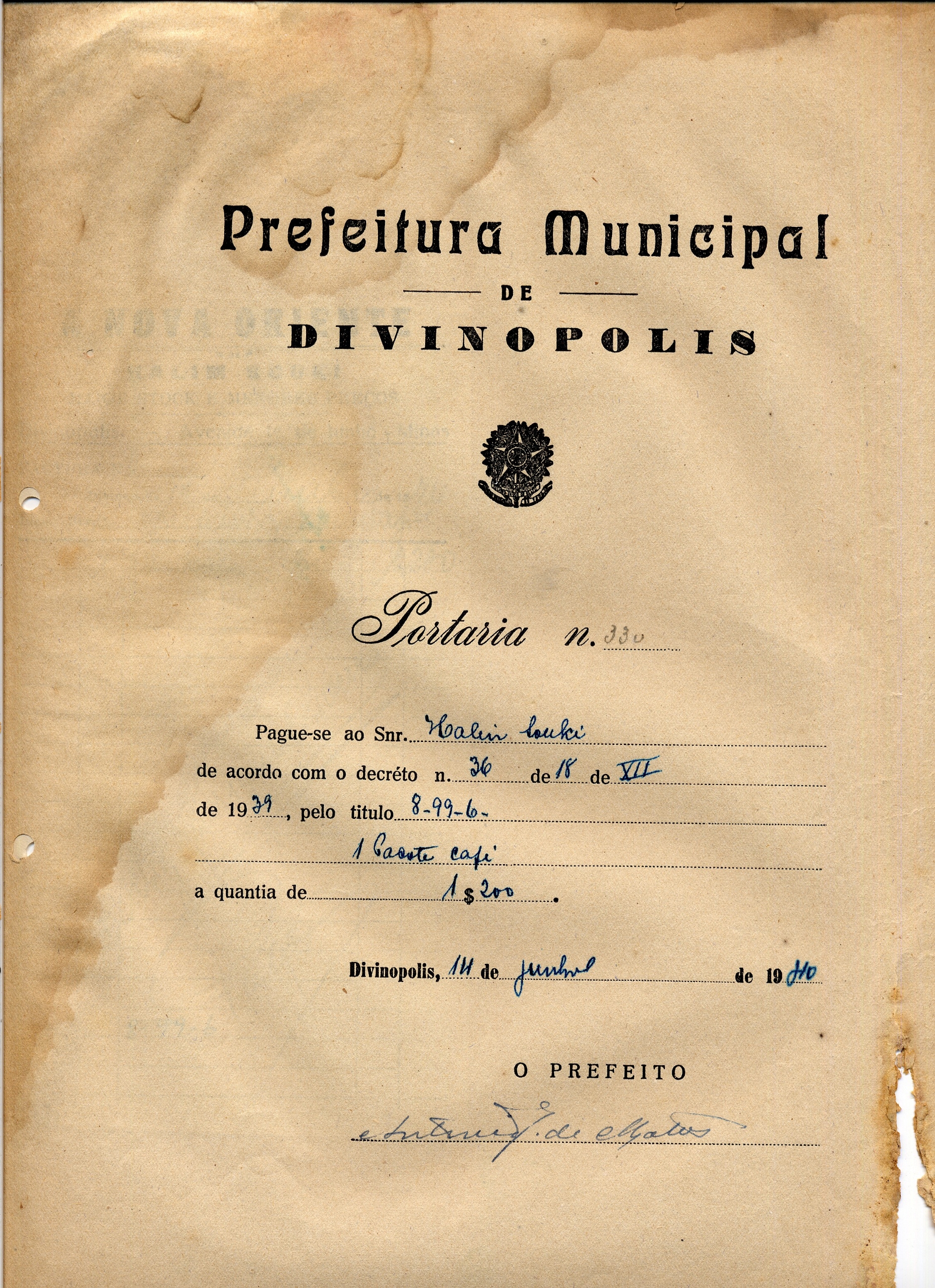 PAGUE-SE AO SNR HALIM SOUKI DE ACORDO COM O DECRETO Nº 36 DE 18 DE XII DE 1939, PELO TÍTULO 8-99-6 - 1 PACOTE CAFÉ A QUANTIA DE 1$200 (HUM MIL E DUZENTOS RÉIS)