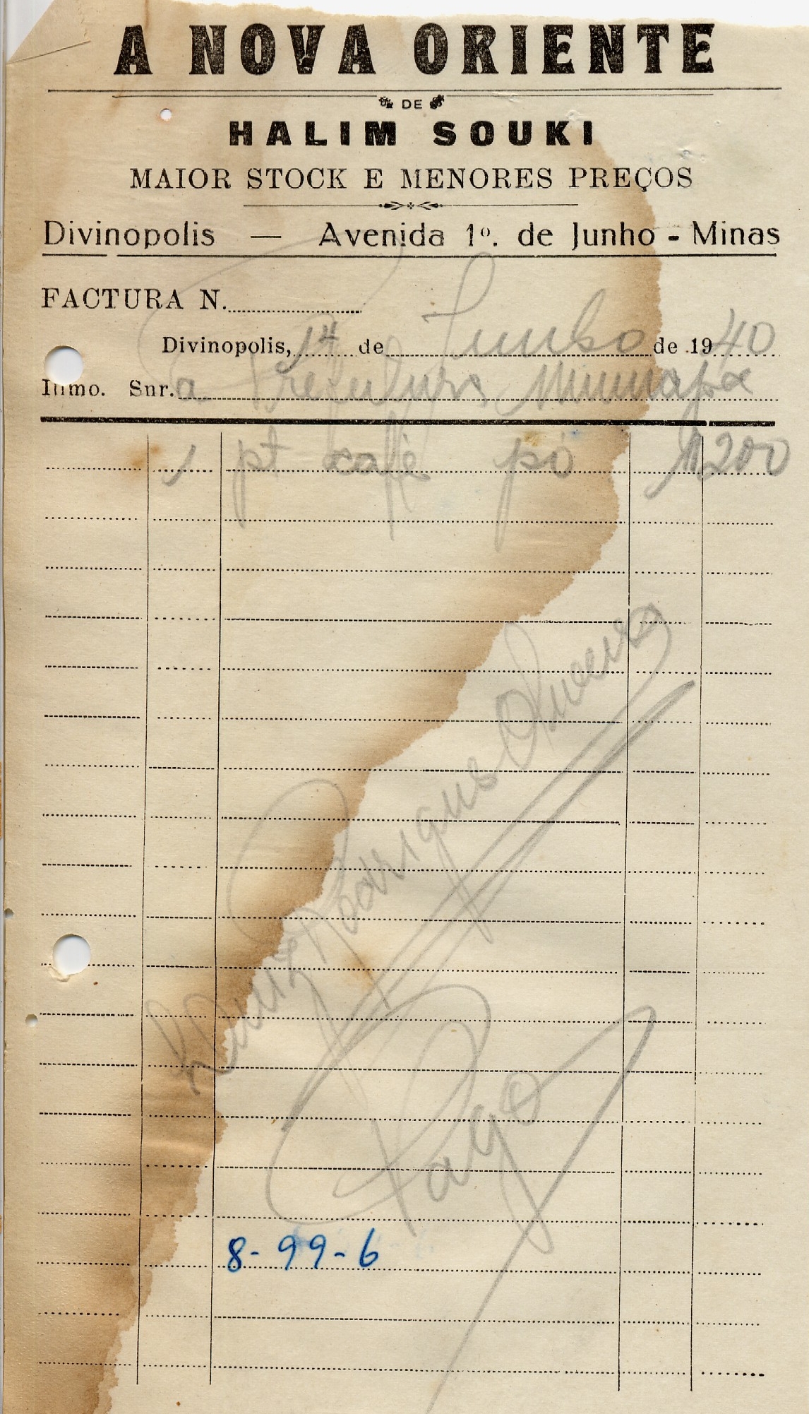 PAGUE-SE AO SNR HALIM SOUKI DE ACORDO COM O DECRETO Nº 36 DE 18 DE XII DE 1939, PELO TÍTULO 8-99-6 - 1 PACOTE CAFÉ A QUANTIA DE 1$200 (HUM MIL E DUZENTOS RÉIS)