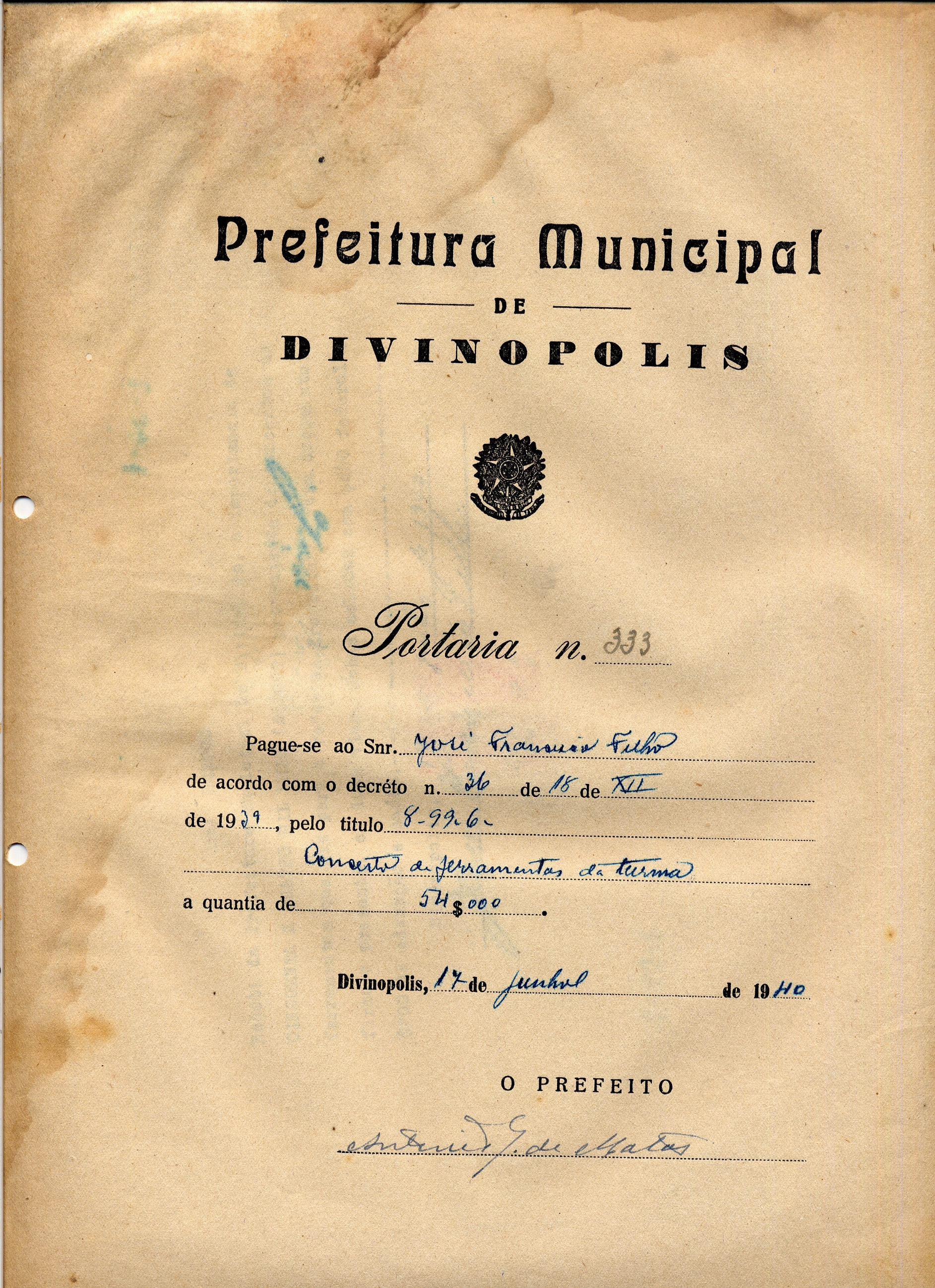 PAGUE-SE AO SNR JOSÉ FRANCISCO FILHO DE ACORDO COM O DECRETO Nº 36 DE 18 DE XII DE 1939, PELO TÍTULO 8-99-6 - CONSERTO DE FERRAMENTAS DA TURMA - A QUANTIA DE 54$000 (CINQUENTA E QUATRO MIL RÉIS)