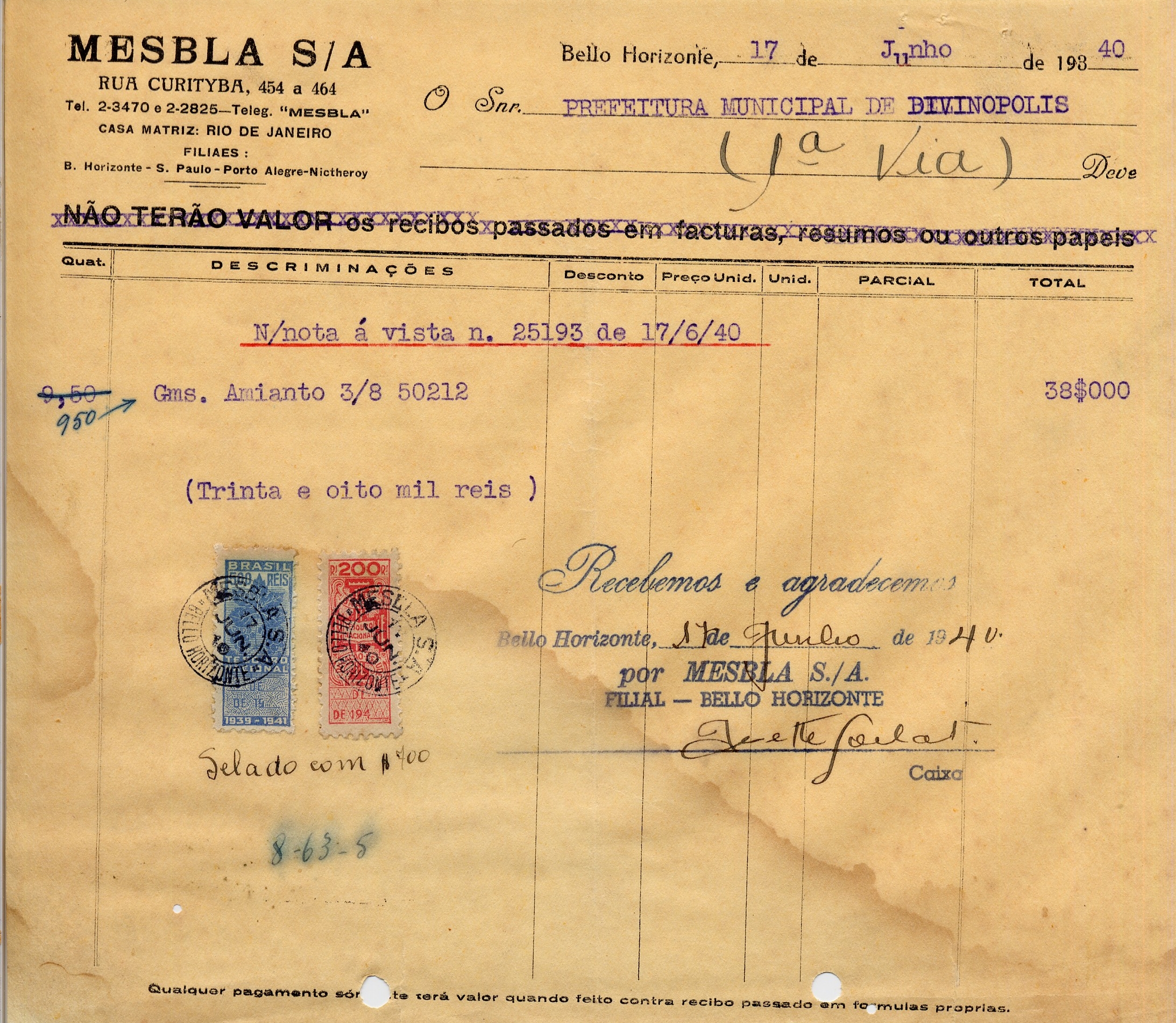 PAGUE-SE AO SNR MESBLA S.A. DE ACORDO COM O DECRETO Nº 36 DE 18 DE XII DE 1939, PELO TÍTULO 8-63-5 - 950 GRMS AMIANTO CORDÃO, GRAFITADO, A QUANTIA DE 38$000 (TRINTA E OITO MIL RÉIS)