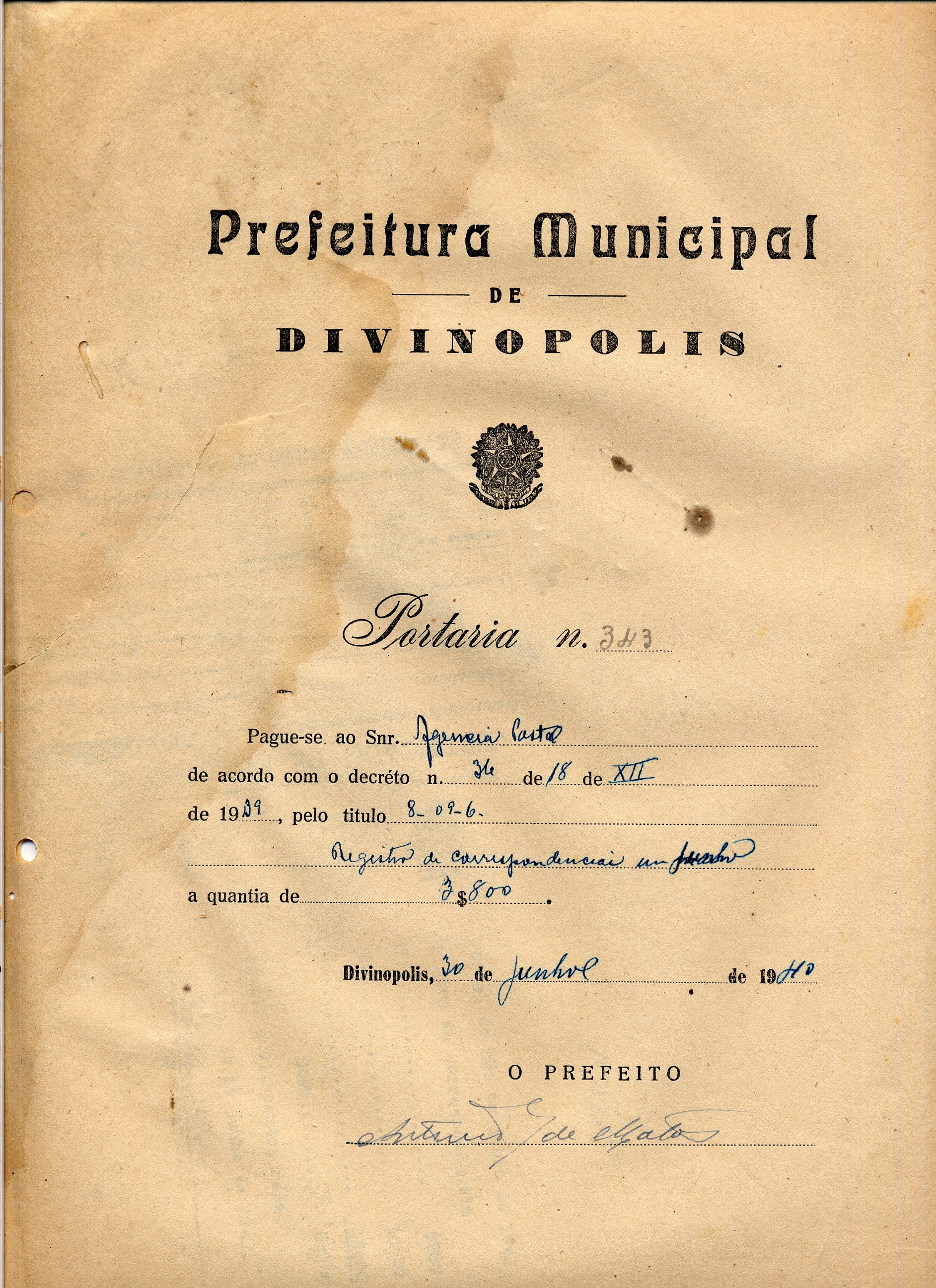 PAGUE-SE AO SNR AGÊNCIA POSTAL DE ACORDO COM O DECRETO Nº 36 DE 18 DE XII DE 1939, PELO TÍTULO 8-09-6 REGISTRO DE CORRESPONDÊNCIA A QUANTIA DE 3$800 (TRÊS MIL E OITOCENTOS RÉIS)