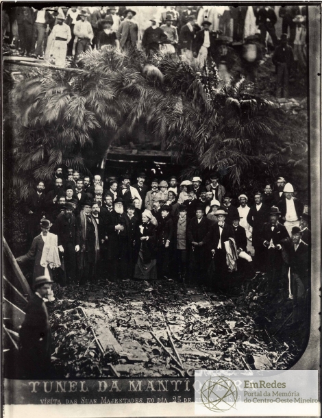 FOTO B - TIRADA NA BOCA DO TÚNEL NA SERRA DA MANTIQUEIRA POR OCASIÃO DA INAUGURAÇÃO DA VIA FÉRREA E 1ª VISITA A MINAS GERAIS FEITA PELO IMPERADOR D. PEDRO II, IMPERATRIZ DONA TERESA CRISTINA, A PRINCESA ISABEL, CONDE D´EU, PRÍNCIPES DOM PEDRO AUGUSTO E DOM AUGUSTO, NETOS DO IMPERADOR E FILHO DE DONA LEOPOLDINA. NA COMITIVA O SENADOR CRISTIANO BENEDITO OTONI, AFONSO CELSO (VISCONDE DE OURO PRETO) JOAQUIM DELFINO P. LUZ (BARÃO DA LAGUNA) AFONSO PENA (MINISTRO DA AGRICULTURA E VIAÇÃO) HERBERT HUNT (RESPONSÁVEL PELA CONSTRUÇÃO DA ESTRADA) OS ENGENHEIROS BURNIER E ALVIM, A BARONESA FONSECA COSTA, MIRANDA AZEVEDO (MÉDICO DA CIA) ENGENHEIRO FISCAL, FRANCISCO MIRANDA DE AZEVEDO E O DEPUTADO GERAL OLÍMPIO OSCAR VILHENA VALADÃO.