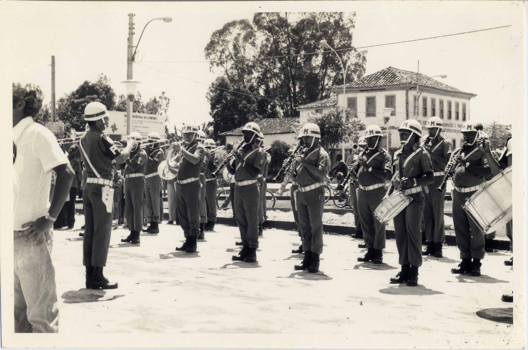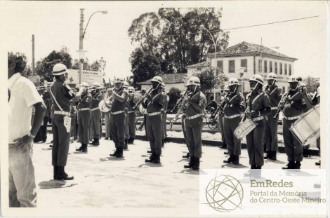 BANDA DA POLÍCIA MILITAR.PRAÇA DOM CRISTIANO, ESCOLA ESTADUAL MONSENHOR DOMINGOS EVANGELISTA PINHEIRO. ATUALMENTE, MUSEU HISTÓRICO DE DIVINÓPOLIS.
