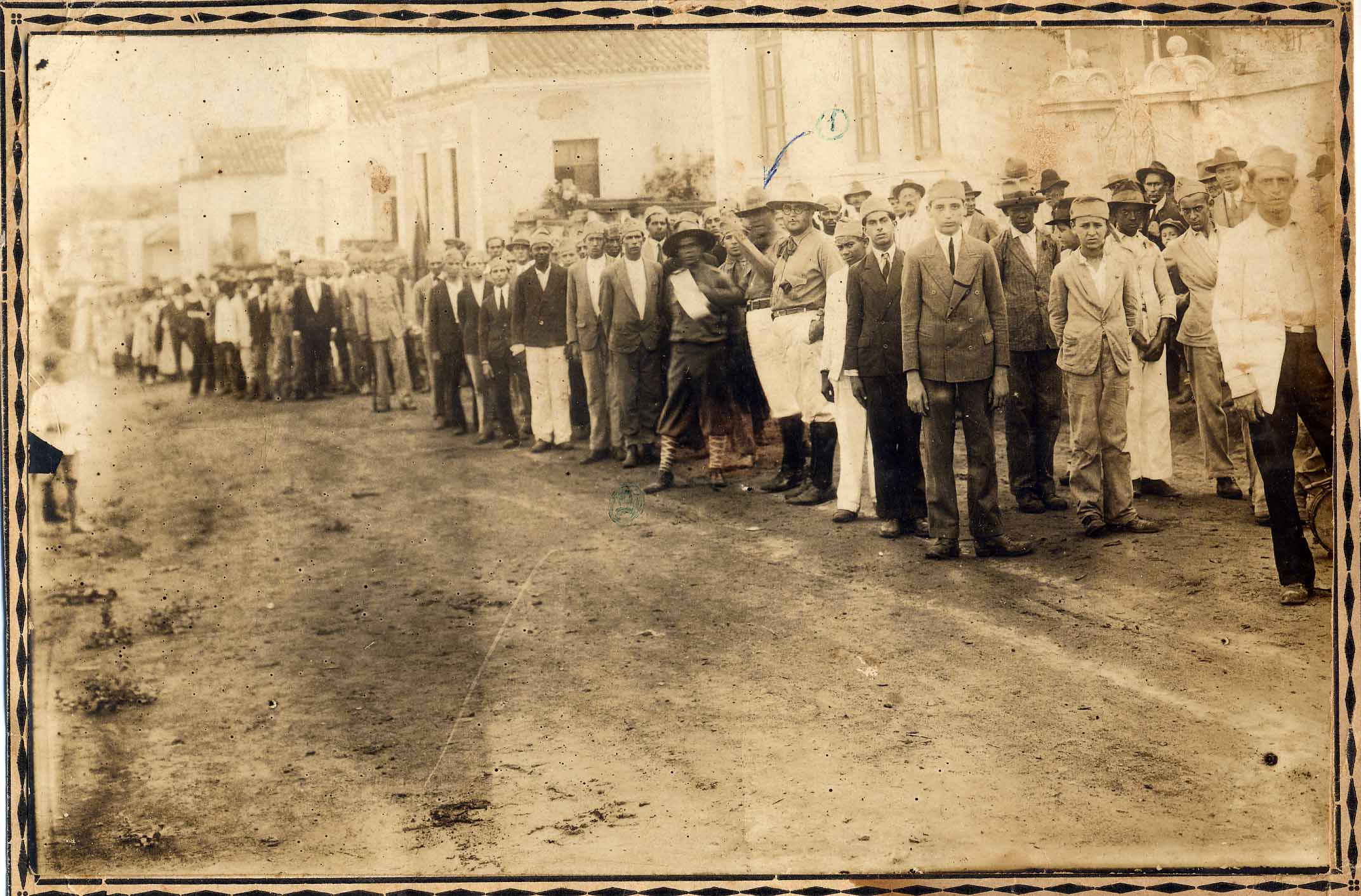 TIRADA EM 04/10/1930. DIA EM QUE FOI DEPOSTO O SR. W. LUIS. GRUPO DO BATALHÃO JOÃO PESSOA EM DIVINÓPOLIS, SENDO SEU COMANDANTE O SR. SINFRONIO GONTIJO DA SILVA CONHECIDO POR CAPITÃO SILVA RETRATO INDICADO PELA SETA.