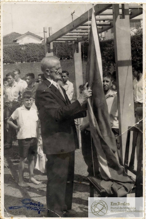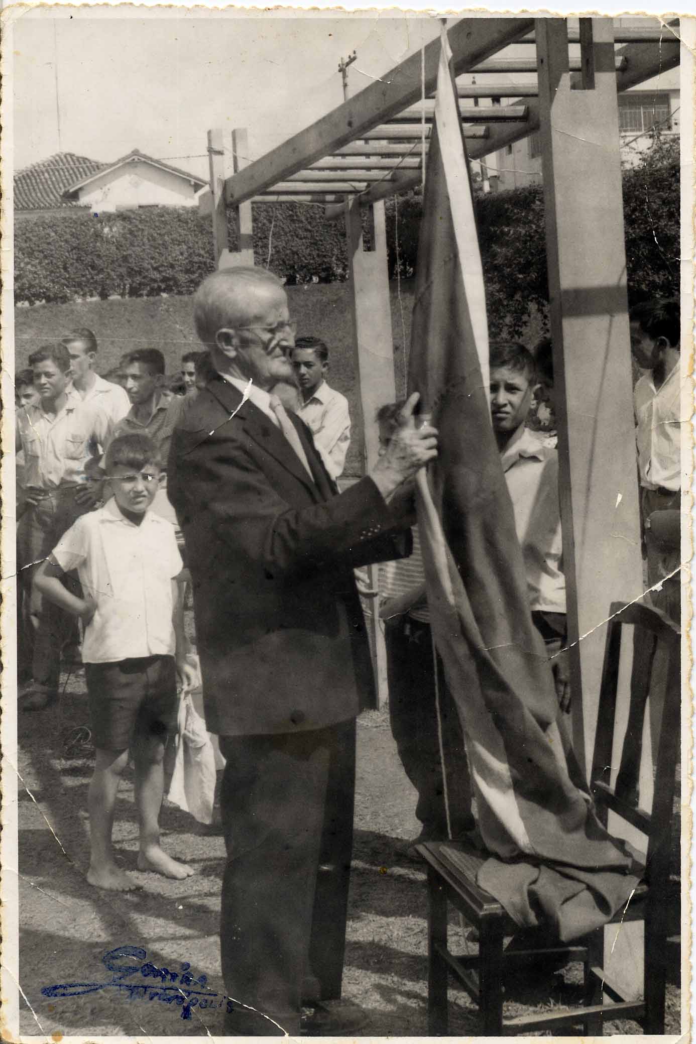 DIRETOR DO COLÉGIO SÃO GERALDO, SR, MARTIN CYPRIEN, HASTEANDO UMA BANDEIRA NA PÇA DE ESPORTES (DTC) EM DIVINÓPOLIS.