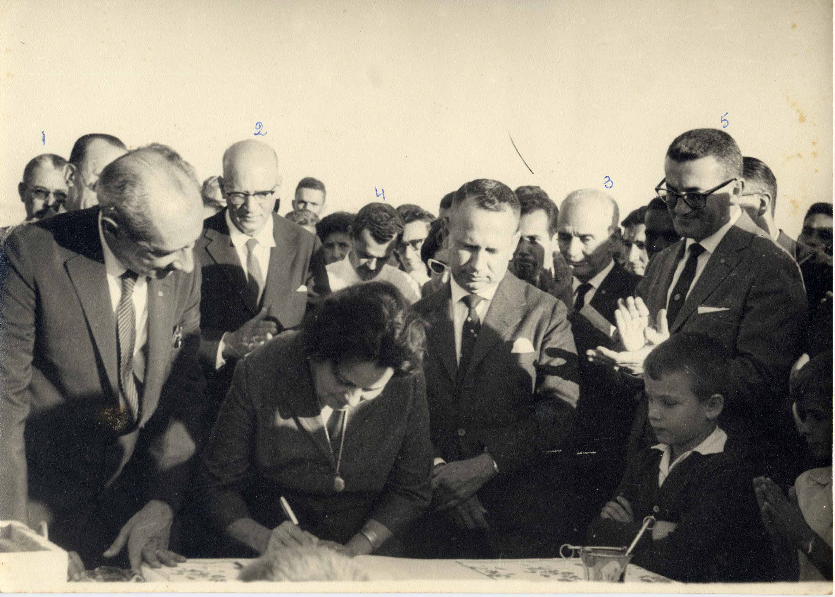 LANÇAMENTO DA PEDRA FUNDAMENTAL DO H.S..J D. ASSINA MADALENA CORRÊA LADEADA POR THEODÓSIO RODRIGUES E GERALDO CORRÊA. APARECEM: DR. SEBASTIÃO G. GUIMARÃES, D. CRISTIANO F.P.DE A. SENA, JOVELINO RABELO, RUI RABELLO, CHARLES SIMÃO (CONSTRUTOR).