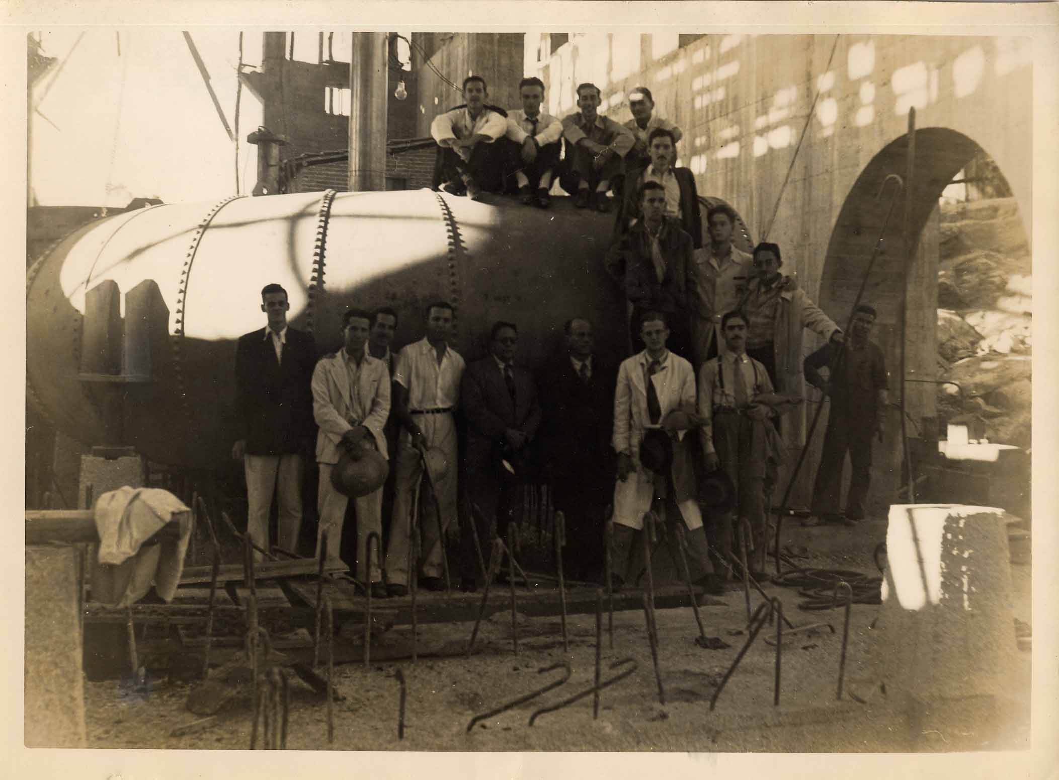 VISITA DOS 4º ANISTAS DA ESCOLA DE MINAS ÀS OBRAS DA USINA DO GAFANHOTO, EM MAIO DE 1944 - VÊ-SE A ESPIRAL DE UMA DAS TURBINAS, EM MONTAGEM.