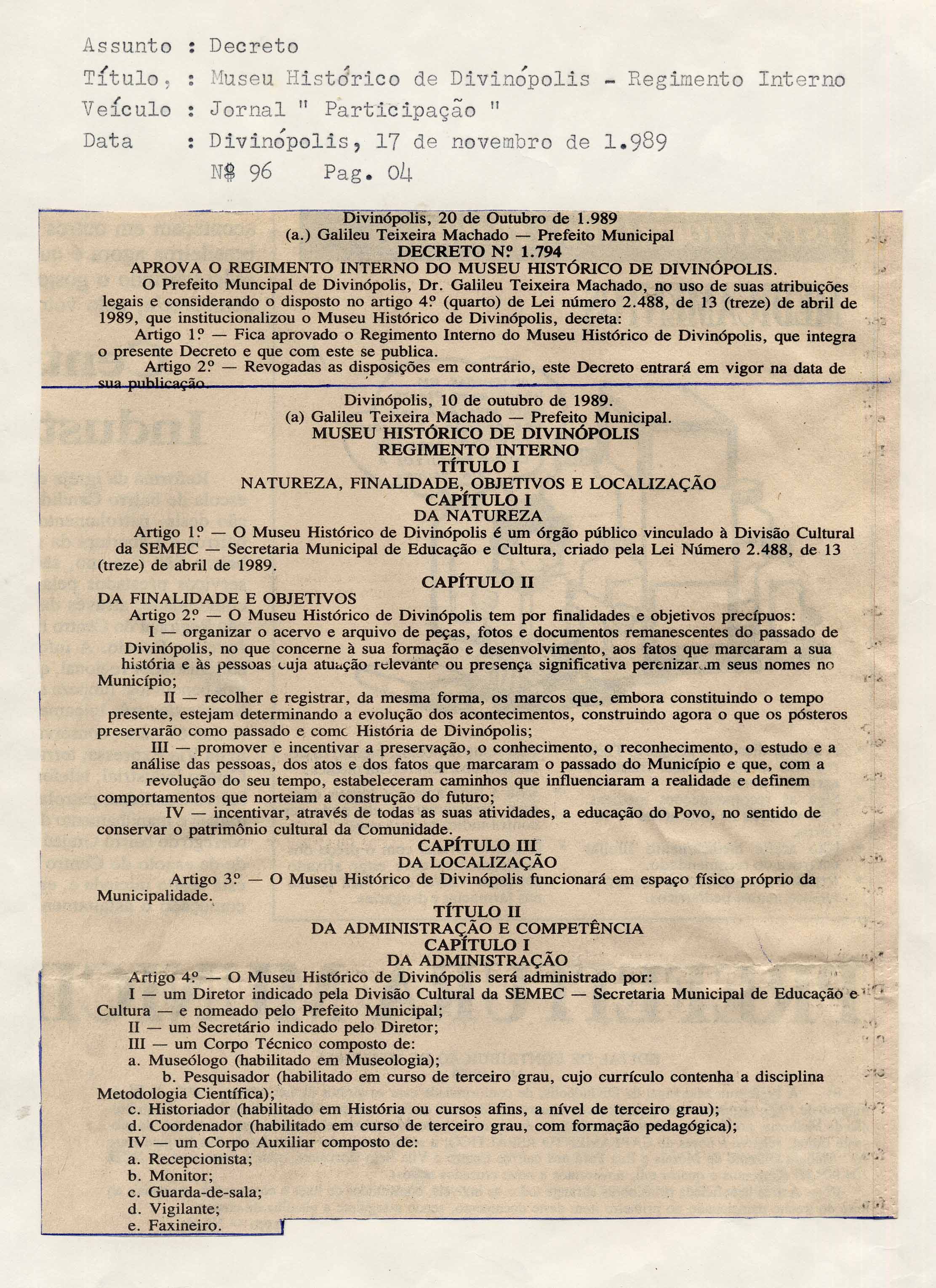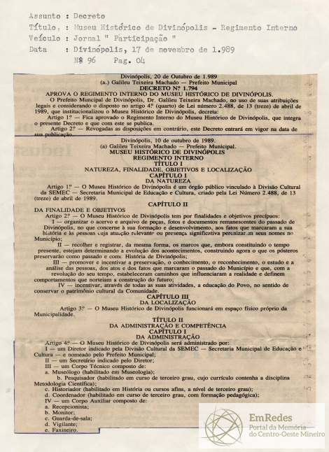 DECRETO - REGIMENTO INTERNO DO MUSEU HISTÓRICO DE DIVINÓPOLIS - VEÍCULO: JORNAL PARTICIPAÇÃO - Nº 96 - PÁG. 04.