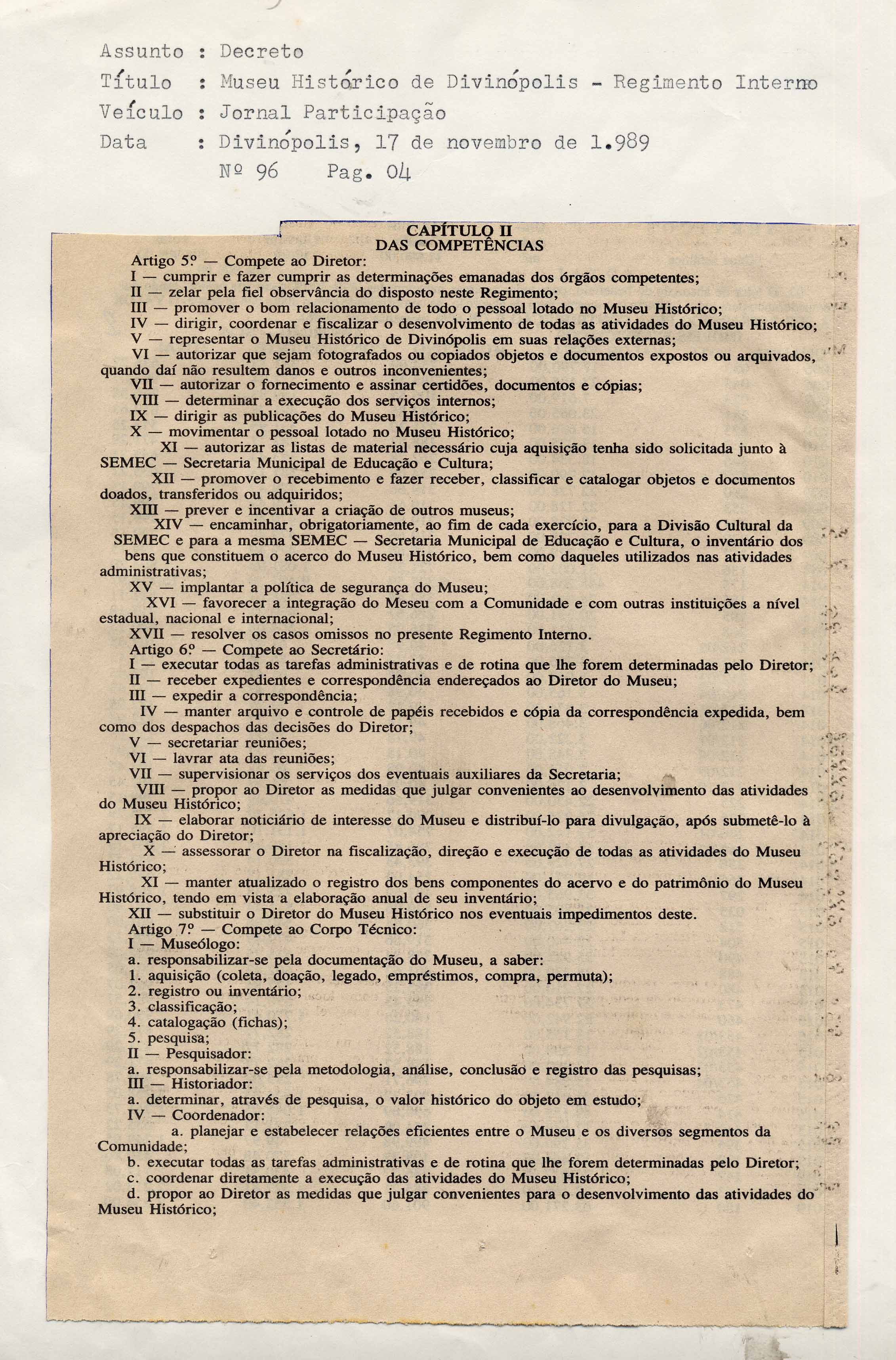 DECRETO - REGIMENTO INTERNO DO MUSEU HISTÓRICO DE DIVINÓPOLIS - VEÍCULO: JORNAL PARTICIPAÇÃO - Nº 96 - PÁG. 04.