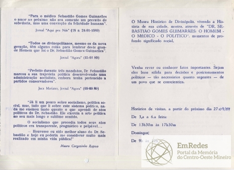 CONVITE DA EXPOSIÇÃO: "DR. SEBASTIÃO GOMES GUIMARÃES - O HOMEM, O MÉDICO, O POLÍTICO" REALIZADA NO MUSEU HISTÓRICO DE DIVINÓPOLIS DE 27/09 A 05/12/1989.