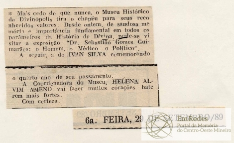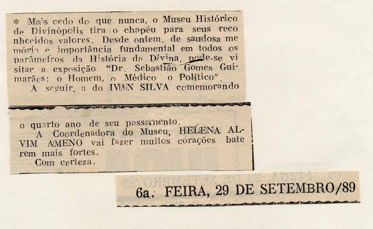 RECORTES DE JORNAL SOBRE A EXPOSIÇÃO: "DR. SEBASTIÃO GOMES GUIMARÃES - O HOMEM, O MÉDICO, O POLÍTICO" REALIZADA NO MUSEU HISTÓRICO DE DIVINÓPOLIS DE 27/09 A 05/12/1989 - MUSEU