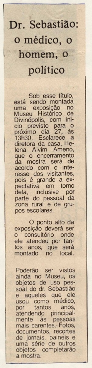 RECORTES DE JORNAL SOBRE A EXPOSIÇÃO: "DR. SEBASTIÃO GOMES GUIMARÃES - O HOMEM, O MÉDICO, O POLÍTICO" REALIZADA NO MUSEU HISTÓRICO DE DIVINÓPOLIS DE 27/09 A 05/12/1989 - MUSEU