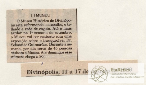 RECORTES DE JORNAL SOBRE A EXPOSIÇÃO: "CAMINHOS DA LIBERDADE" E A REFORMA DO MUSEU HISTÓRICO DE DIVINÓPOLIS.