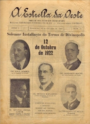 JORNAL: A ESTRELLA DA OESTE - NOTÍCIAS, REPORTAGENS, INFORMAÇÕES E PROPAGANDAS. PRIMEIRA PÁGINA: "SOLEMNE(SIC) INSTALLAÇÃO(SIC) O TERMO DE DIVINÓPOLIS" ONDE SE TEM AS FOTSO DOS SRS: DR. RAUL SOARES - DR. OLEGÁRIO MACIEL - DR. AFFONSO PENNA JÚNIOR - DR. ARTHUR BERNARDES - DR. FERNANDO DE MELLO VIANNA.