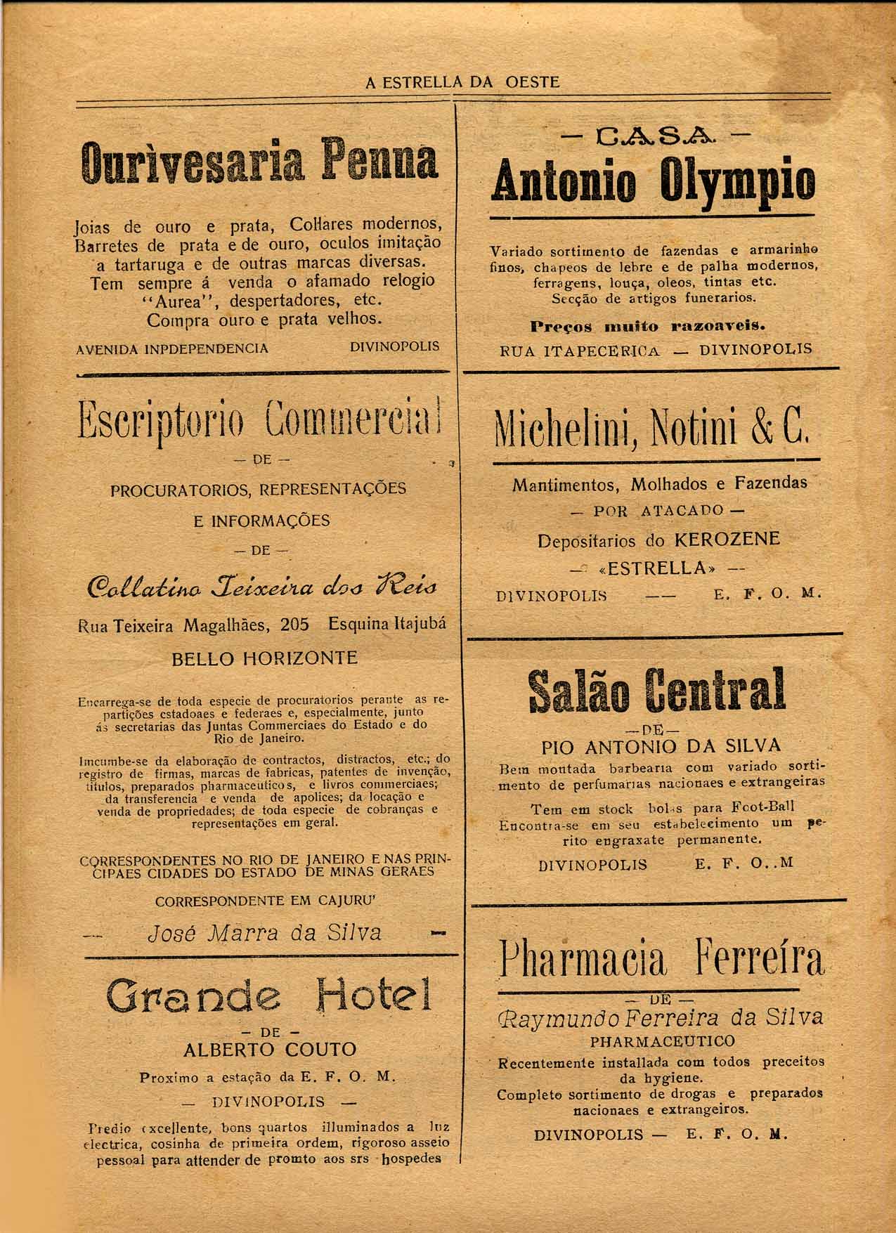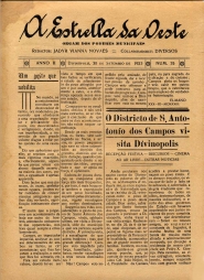 JORNAL: A ESTRELLA DA OESTE - NOTÍCIAS, REPORTAGENS, INFORMAÇÕES E PROPAGANDAS. PRIMEIRA PÁGINA: "NOBILÍTA" - "O DISTRICTO(SIC) DE SANTO ANTONIO DOS CAMPOS VISITA DIVINÓPOLIS".