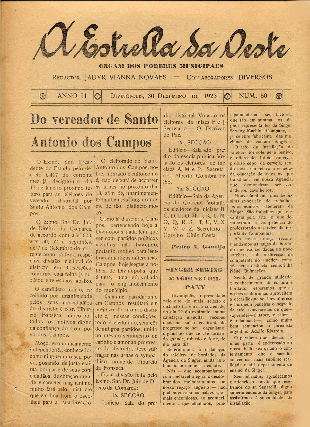JORNAL: A ESTRELLA DA OESTE - NOTÍCIAS, REPORTAGENS, INFORMAÇÕES E PROPAGANDAS. PRIMEIRA PÁGINA: "DO VEREADOR DE SANTO ANTONIO DOS CAMPOS" - "SINGER SEWING MACHINE COMPANY".