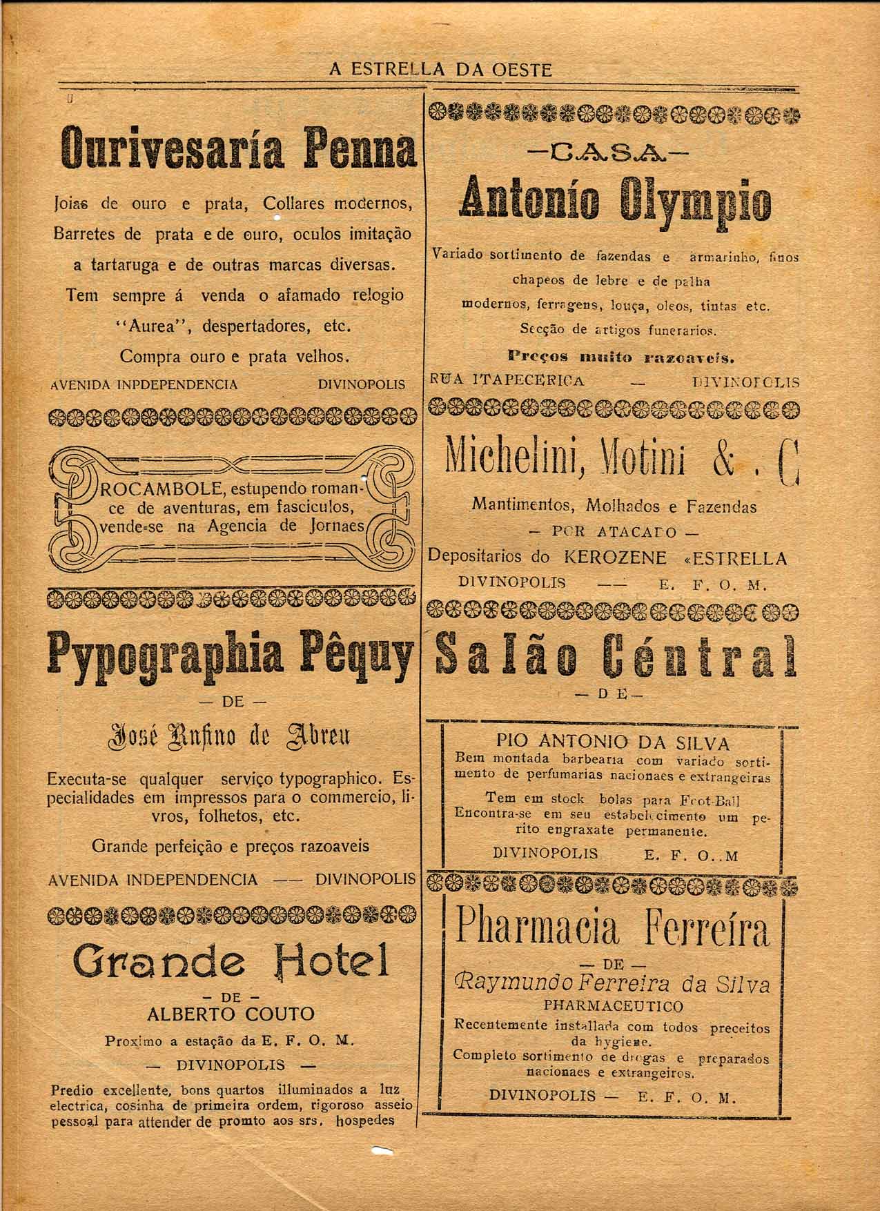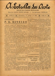 JORNAL: A ESTRELLA DA OESTE - NOTÍCIAS, REPORTAGENS, INFORMAÇÕES E PROPAGANDAS. PRIMEIRA PÁGINA: "A REUNIÃO DO P. R. MINEIRO" - "PONTO CHIC" - "GRÊMIO LITERÁRIO PEDRO GONTIJO".