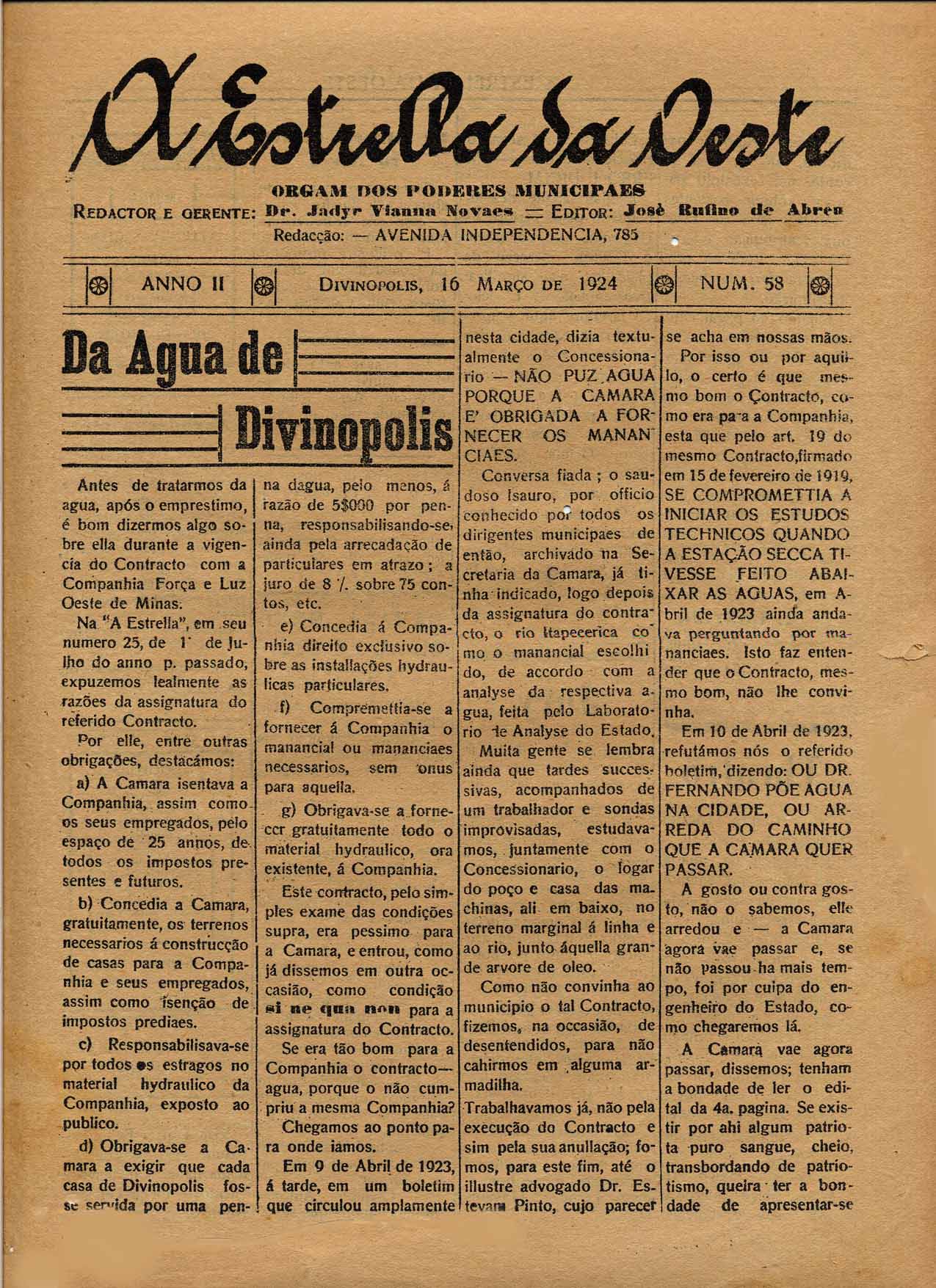 JORNAL: A ESTRELLA DA OESTE - NOTÍCIAS, REPORTAGENS, INFORMAÇÕES E PROPAGANDAS. PRIMEIRA PÁGINA: "DA AGUA(SIC) DE DIVINOPOLIS(SIC)".