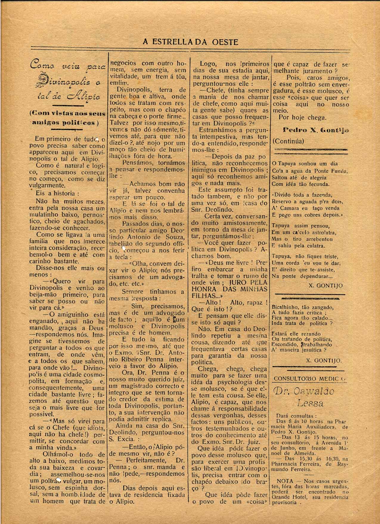 JORNAL: A ESTRELLA DA OESTE - NOTÍCIAS, REPORTAGENS, INFORMAÇÕES E PROPAGANDAS. PRIMEIRA PÁGINA: "COMMENTANDO(SIC)" - "3 DE MAIO" - "PORCOS".