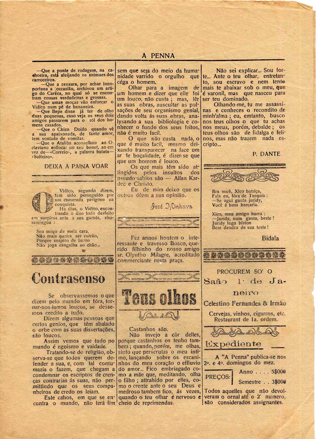 JORNAL "A PENNA" - NOTÍCIAS, REPORTAGENS, INFORMAÇÕES, ARTIGOS GERAIS E PROPAGANDAS DIVERSAS. PRIMEIRA PÁGINA: "O BREVE" - ARTIGO ASSINADO POR AGA.