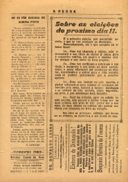 JORNAL "A PENNA" - NOTÍCIAS, REPORTAGENS, INFORMAÇÕES, ARTIGOS GERAIS E PROPAGANDAS DIVERSAS. PRIMEIRA PÁGINA: "MANIFESTO COM QUE SE APRESENTA AOS SUFFRÁGIOS(SIC) DO POVO MINEIRO 0 DR. OLEGÁRIO DIAS MACIEL, FUTURO PRESIDENTE DO ESTADO (CONTINUAÇÃO)".