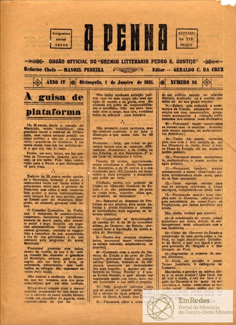 JORNAL "A PENNA" - NOTÍCIAS, REPORTAGENS, INFORMAÇÕES, ARTIGOS GERAIS E PROPAGANDAS DIVERSAS. PRIMEIRA PÁGINA: "À GUISA DE PLATAFORMA".