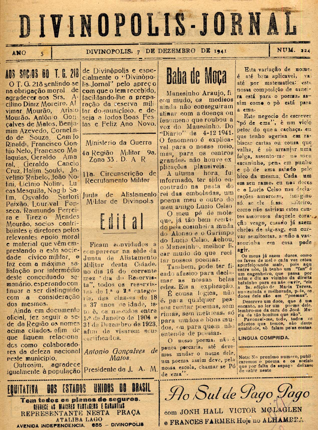 DIVINÓPOLIS JORNAL - NOTÍCIAS, REPORTAGENS E INFORMAÇÕES DIVERSAS, PROPAGANDAS. PRIMEIRA PÁGINA: "AOS SÓCIOS DO T.G. 218" E "BABA DE MOÇA".