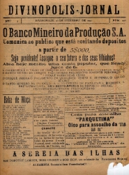 DIVINÓPOLIS JORNAL - NOTÍCIAS, REPORTAGENS E INFORMAÇÕES DIVERSAS, PROPAGANDAS. PRIMEIRA PÁGINA: "O BANCO MINEIRO DA PRODUÇÃO COMUNICA AO PÚBLICO QUE ESTÁ ACEITANDO DEPÓSITOS A PARTIR DE 5$000..." E "BABA DE MOÇA".