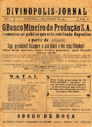 DIVINÓPOLIS JORNAL - NOTÍCIAS, REPORTAGENS E INFORMAÇÕES DIVERSAS, PROPAGANDAS. PRIMEIRA PÁGINA: "O BANCO MINEIRO DA PRODUÇÃO COMUNICA AO PÚBLICO QUE ESTÁ ACEITANDO DEPÓSITOS A PARTIR DE 5$000..." E "NATAL".
