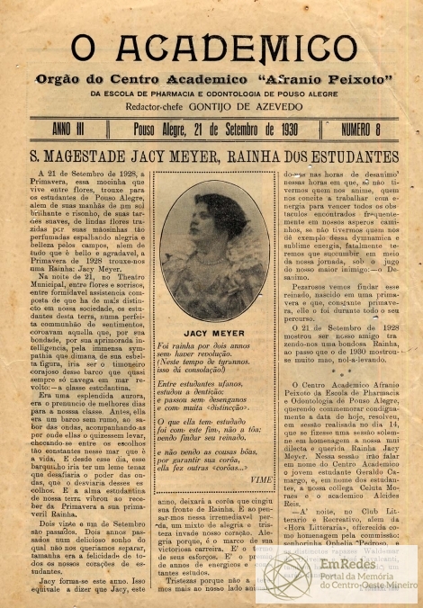 JORNAL O ACADÊMICO - NOTICIAS, REPORTAGENS E LITERATURA. PRIMEIRA PÁGINA: S. MAGESTADE JACY, RAINHA DOS ESTUDANTES.