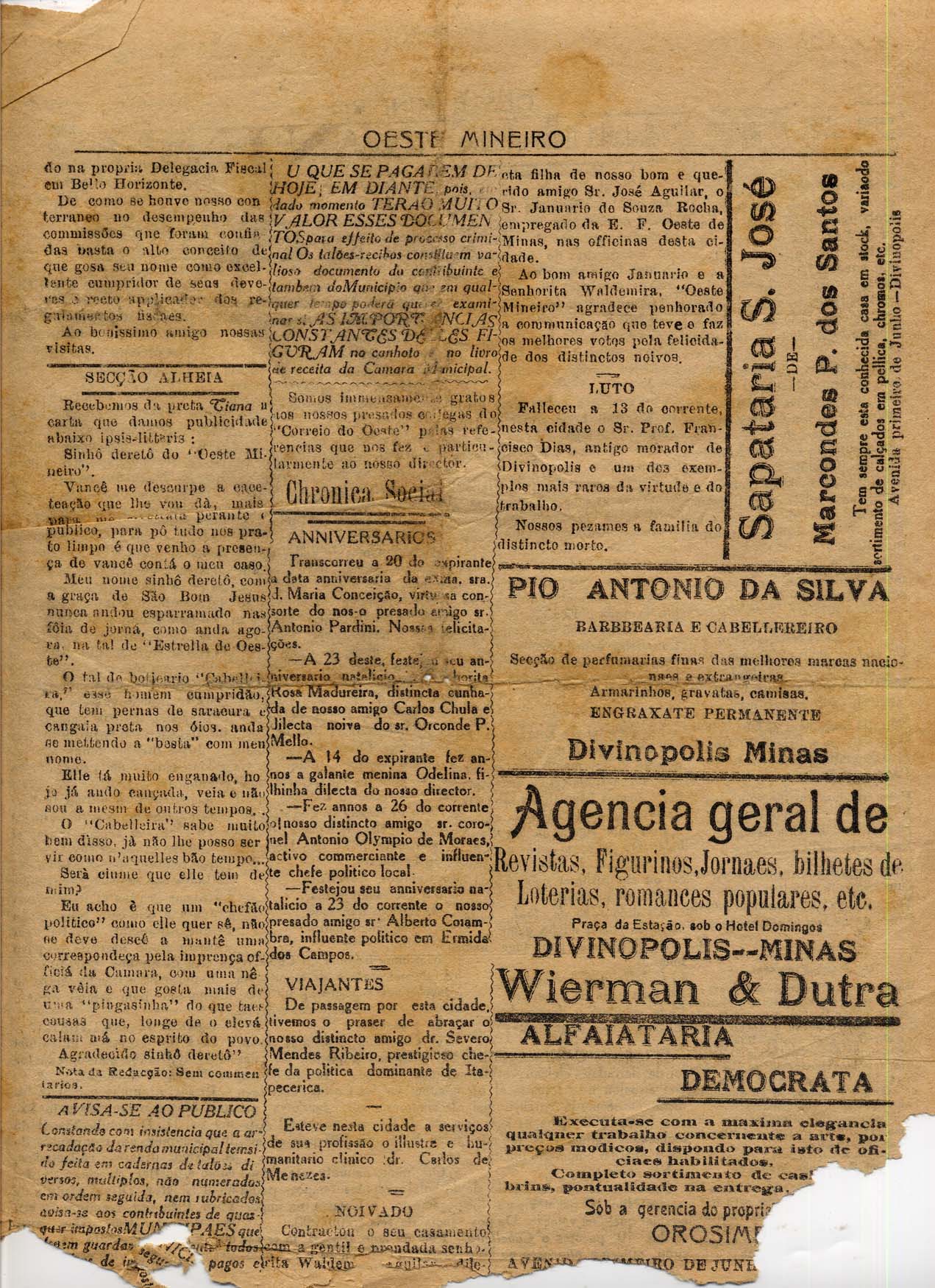 JORNAL "OESTE MINEIRO" - NOTÍCIAS, REPORTAGENS, LITERATURA - INFORMAÇÕES E REIVINDICAÇÕES DA POPULAÇÃO- PRINCIPAL MANCHETE: "CYNISMO(SIC) OU INCONSCIENCIA(SIC)? SILENCIO(SIC) CRIMINOSO"