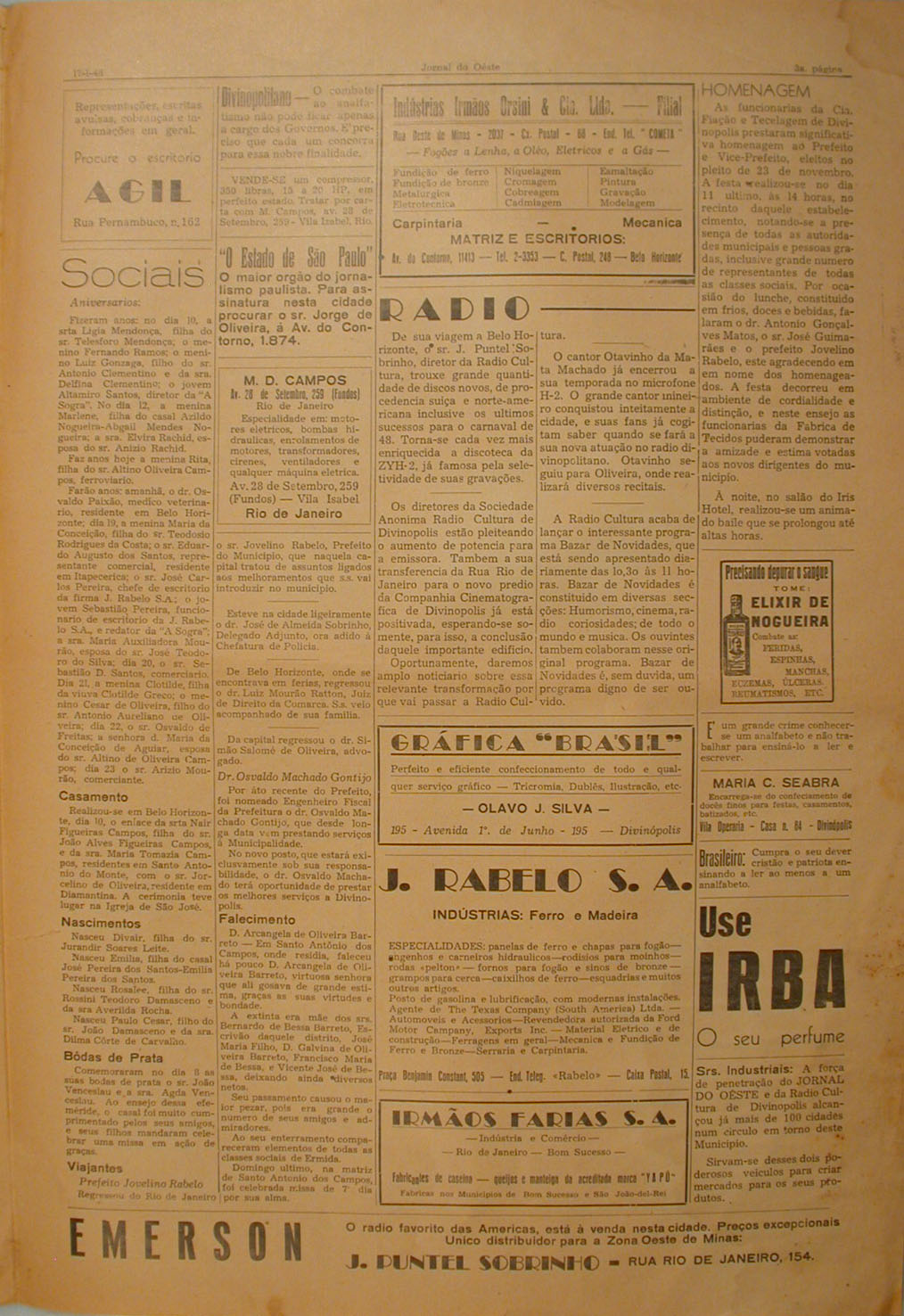 Terceira página do Jornal do Oeste, ano II, número 59, Divinópolis, 17 de janeiro de 1948. Contém artigos "Sociais", "Homenagem", "Radio" e propagandas.