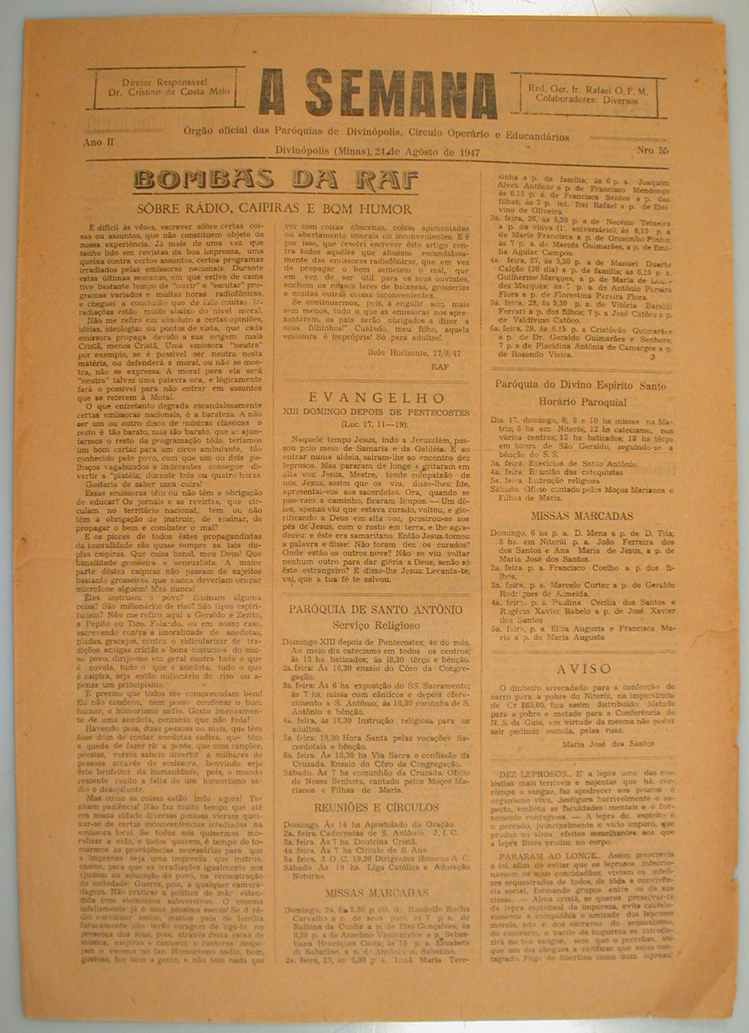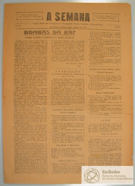 JORNAL A SEMANA: NOTÍCIAS, REPORTAGENS, ARTIGOS RELIGIOSOS E HISTÓRICOS - HISTÓRIA DA CIDADE DE DIVINÓPOLIS E O CONTEXTO MUNDIAL - INFORMAÇÕES GERAIS, PROPAGANDAS. PRIMEIRA PÁGINA: "BOMBAS DA RAF: SÔBRE RÁDIO, CAIPIRAS E BOM HUMOR" - PÁGINA 2: "APOSTOLADO PARA TODOS" - "AÇÃO SOCIAL E CÍRCULO OPERÁRIO" - "HISTÓRIA DA RELIGÃO E DA IGREJA" - OUTROS - PÁGINA 4: "UM RETRRATO" - "MIGALHAS" - CINEMA E TEATRO E OUTROS ARTIGOS.