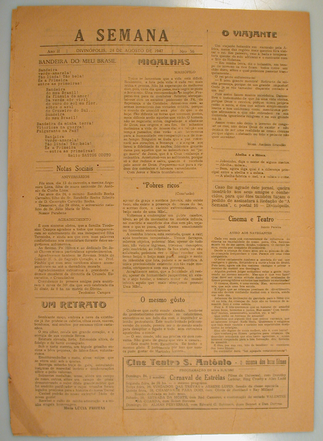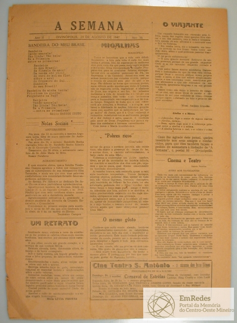 JORNAL A SEMANA: NOTÍCIAS, REPORTAGENS, ARTIGOS RELIGIOSOS E HISTÓRICOS - HISTÓRIA DA CIDADE DE DIVINÓPOLIS E O CONTEXTO MUNDIAL - INFORMAÇÕES GERAIS, PROPAGANDAS. PRIMEIRA PÁGINA: "BOMBAS DA RAF: SÔBRE RÁDIO, CAIPIRAS E BOM HUMOR" - PÁGINA 2: "APOSTOLADO PARA TODOS" - "AÇÃO SOCIAL E CÍRCULO OPERÁRIO" - "HISTÓRIA DA RELIGÃO E DA IGREJA" - OUTROS - PÁGINA 4: "UM RETRRATO" - "MIGALHAS" - CINEMA E TEATRO E OUTROS ARTIGOS.