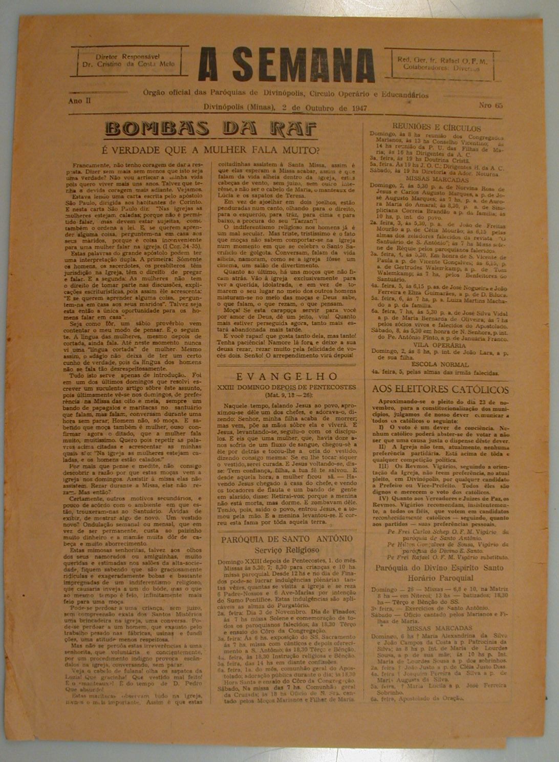 Jornal A Semana: notícias, reportagens, artigos religiosos e históricos - história da cidade de Divinópolis e o contexto mundial - informações gerais, propagandas. primeira página: "bombas da RAF: é verdade que a mulher fala muito?" - página 2: condescendência à-toa" - "emissoras mineiras colaboram na campanha de alfabetização" - "Moscou perdeu importante posto de observação" - página 4: cinema e teatro e outros artigos.
