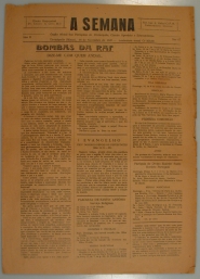 Jornal A Semana: contém notícias, reportagens, artigos religiosos e históricos - um pouco da história da cidade de Divinópolis, e o contexto mundial - informações gerais, propagandas. primeira página: "bombas da RAF: dize-me com quem andas..."- página 2: "procurando a felicidade" - página 4: cinema e teatro e outros artigos.