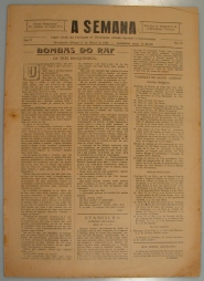 Jornal a semana: notícias, reportagens, artigos religiosos e históricos - história da cidade de Divinópolis e o contexto mundial - informações gerais, propagandas. primeira página: "bombas do raf: os três banquinhos..."[sobre educação de filhos] - página 2: "a voz do S. padre" - "importantes declarações de Marshall" - página 4: cinema e teatro e outros artigos.