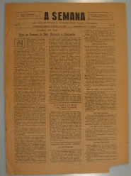 Jornal A Semana: notícias, reportagens, artigos religiosos e históricos, contém um pouco da história da cidade de Divinópolis e o contexto mundial - informações gerais, propagandas. primeira página: "bombas do raf: ecos da romaria de belo horizonte a Divinópolis"- página 2: "murros em faca de ponta " - página 4: notas sociais, cinema e teatro e outros artigos.