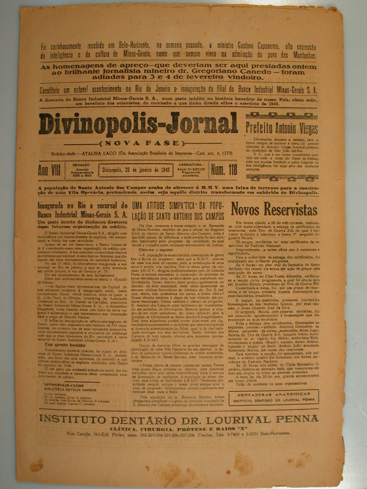 Primeira página do Divinópolis Jornal, ano 8, número 118. Divinópolis, 28/01/1945.