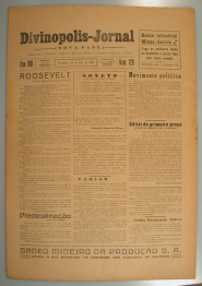 Divinópolis Jornal, contém reportagens, notícias, informações, propagandas e artigos diversos. manchete em destaque, * Primeira página: "como símbolo da gratidão continental , a sepultura de Roosevelt terá um pouco de terra de cada uma das nações da América!" - "tenhamos melhor compreensão de patriotismo! o momento impõe a maior decência política!" - "o povo deve escolher, sem peias e sem subôrno, os seus dirigentes, para o advento de uma época de paz e de trabalho!" - última página: "Roosevelt" [sobre a morte do presidente]