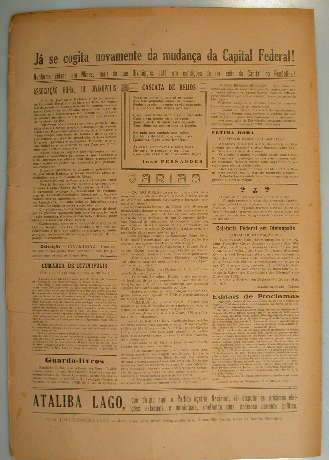 Divinópolis Jornal, contém artigos, reportagens, informações notícias e propagandas diversas. * Primeira página: vai ser fundada a associação rural de Divinópolis, gritos no deserto. * Segunda página: os amigos da onça. * Terceira página: propagandas diversas. * Quarta página: já se cogita novamente da mudança da capital federal, e outras informações diversas.