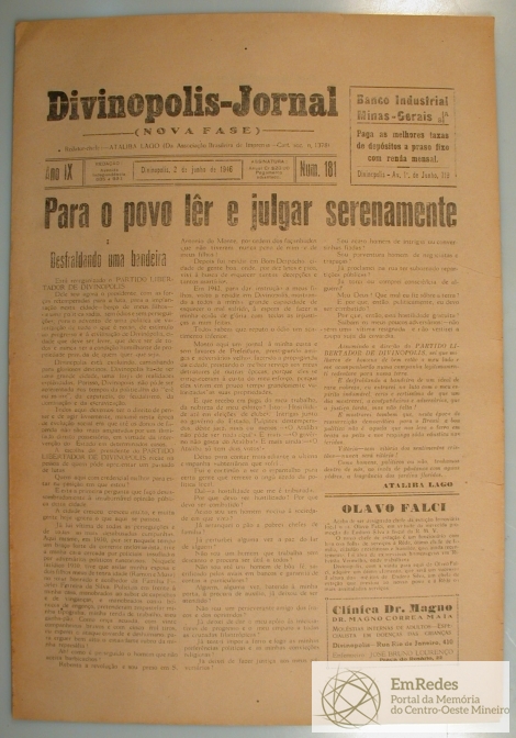Primeira página do Divinópolis Jornal, ano 9, número 181. Divinópolis, 02/06/1946.