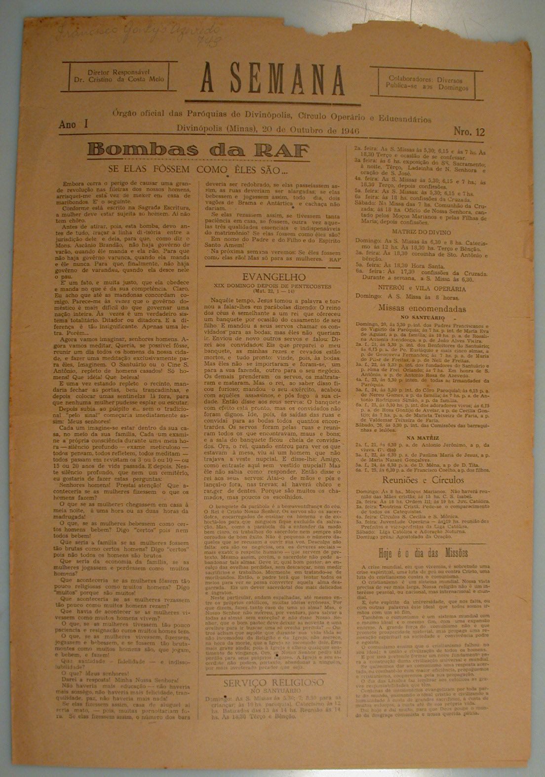 JORNAL A SEMANA: NOTÍCIAS, REPORTAGENS, ARTIGOS RELIGIOSOS E HISTÓRICOS - HISTÓRIA DA CIDADE DE DIVINÓPOLIS E O CONTEXTO MUNDIAL - INFORMAÇÕES GERAIS, PROPAGANDAS. PRIMEIRA PÁGINA: "BOMBAS DA RAF: SE ELAS FOSSEM COMO ELES SÃO..." [ARTIGO SOBRE AS DIFERENÇAS NAS ATITUDES DE HOMENS E MULHERES] - PÁGINA 2: "URGENTE REFORMA SOCIAL CRISTÃ" - "PARA QUEM A PALESTINA?(CONTINUAÇÃO)" - CÍRCULO OPERÁRIO: "NOTÍCIAS" - PÁGINA 4:"PAGAMENTOS DE SALÁRIOS" - CINEMA E TEATRO E OUTROS ARTIGOS.