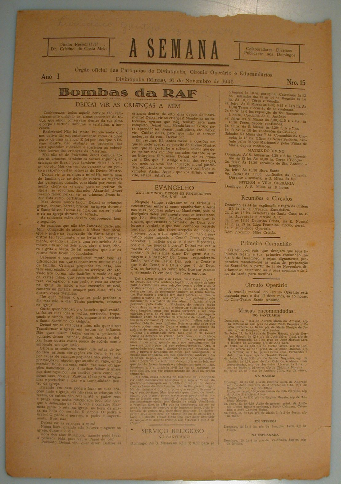 JORNAL A SEMANA: NOTÍCIAS, REPORTAGENS, ARTIGOS RELIGIOSOS E HISTÓRICOS - HISTÓRIA DA CIDADE DE DIVINÓPOLIS E O CONTEXTO MUNDIAL - INFORMAÇÕES GERAIS, PROPAGANDAS. PRIMEIRA PÁGINA: "BOMBAS DA RAF:DEIXAI VIR AS CRIANÇAS A MIM" - PÁGINA 2: "A QUESTÃO SOCIAL" - "PARABÉNS, AMADORES DO CTM" [SOBRE PEÇA DO CONJUNTO TEATRAL MARIANO" - PÁGINA 4:"LIBERDADE NAS ELEIÇÕES" - CINEMA E TEATRO E OUTROS ARTIGOS.